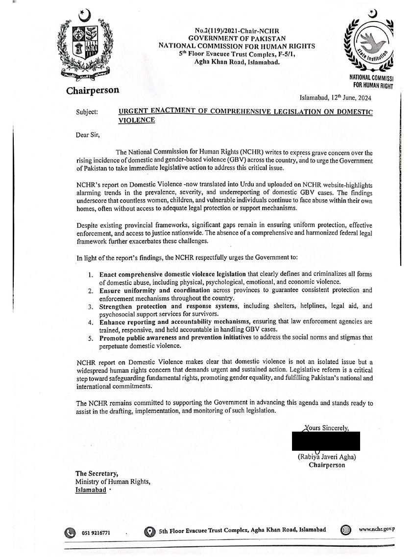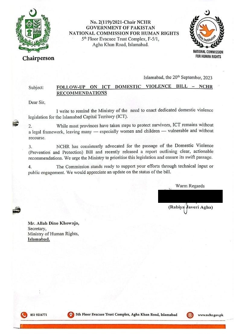 NCHR has consistently advocated for robust domestic violence legislation at both federal and territorial levels. In September 2023, the Commission urged the Ministry of Human Rights to prioritize the passage of the Domestic Violence (Prevention and Protection) Bill for Islamabad Capital Territory. In June 2024, following the release of NCHR’s domestic violence report, the Commission issued a follow-up letter calling for comprehensive federal legislation to ensure uniform protection, strengthen response systems, and address the alarming prevalence of gender-based violence nationwide.