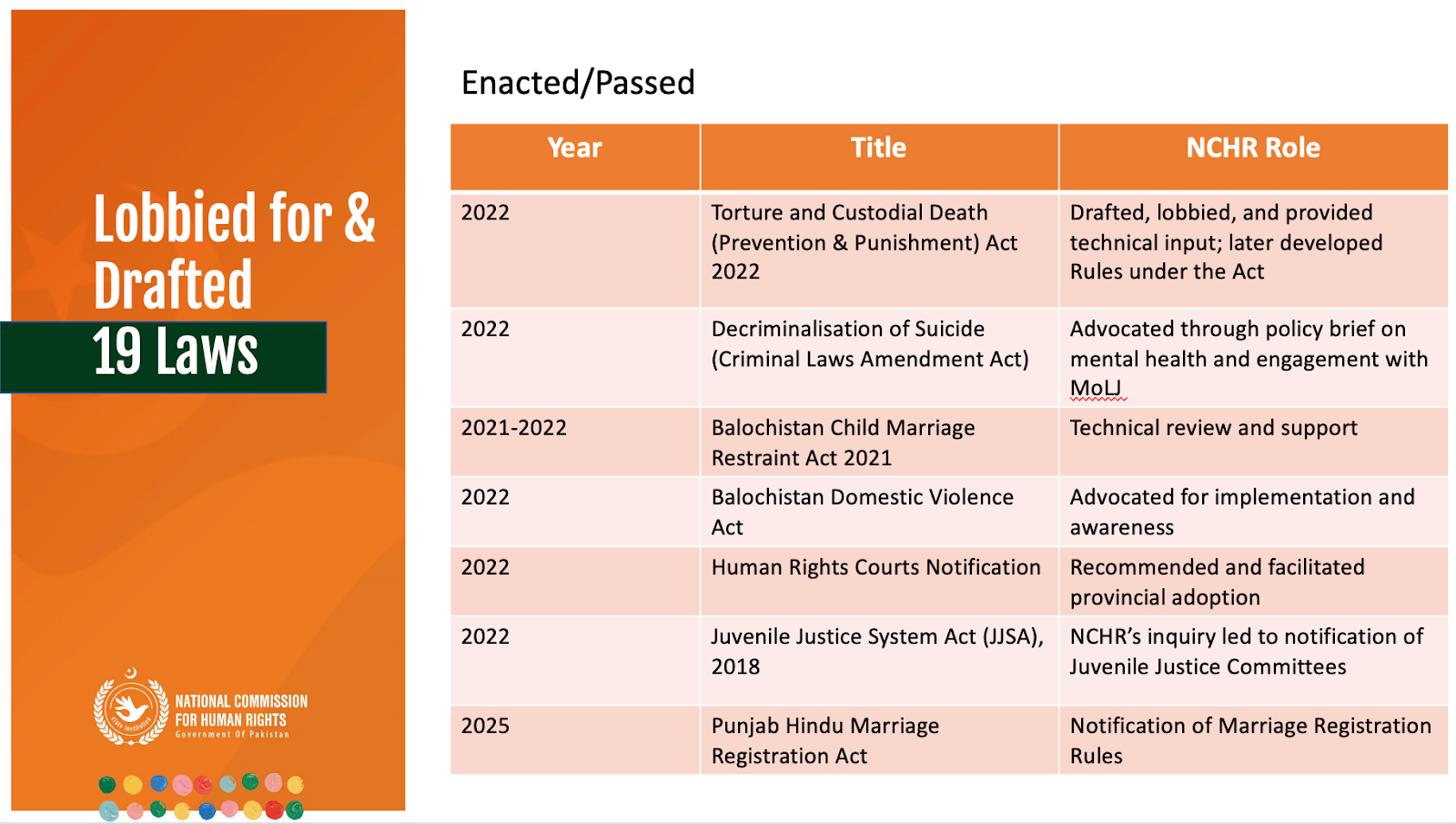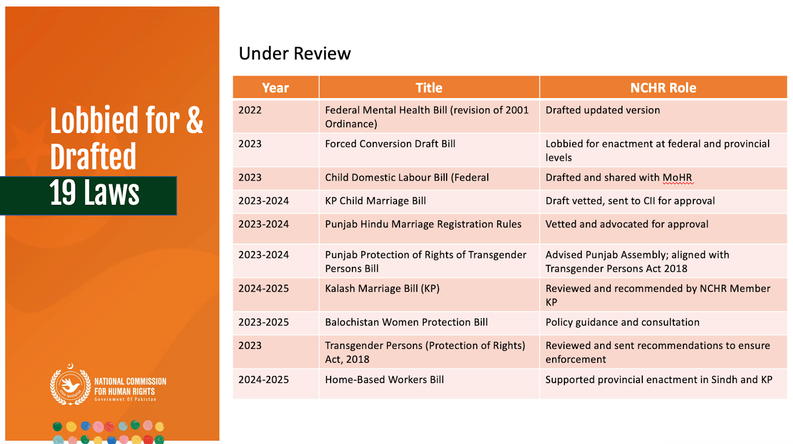 - NCHR recommended for the passing of an updated Mental Health Act, advocated for the removal of Section 20 of the Prevention of Electronic Crimes Act 2016, and voiced concerns on PECA Amendment Act 2023, leading to its withdrawal by the Information Ministry.